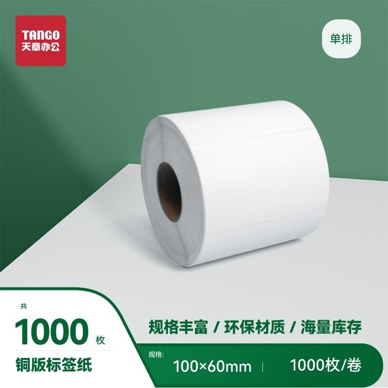 天章 (TANGO)新绿天章铜版纸不干胶条码标签打印纸 碳带标签打印机纸物流货物条码标签纸 单排100x60x1000枚/卷