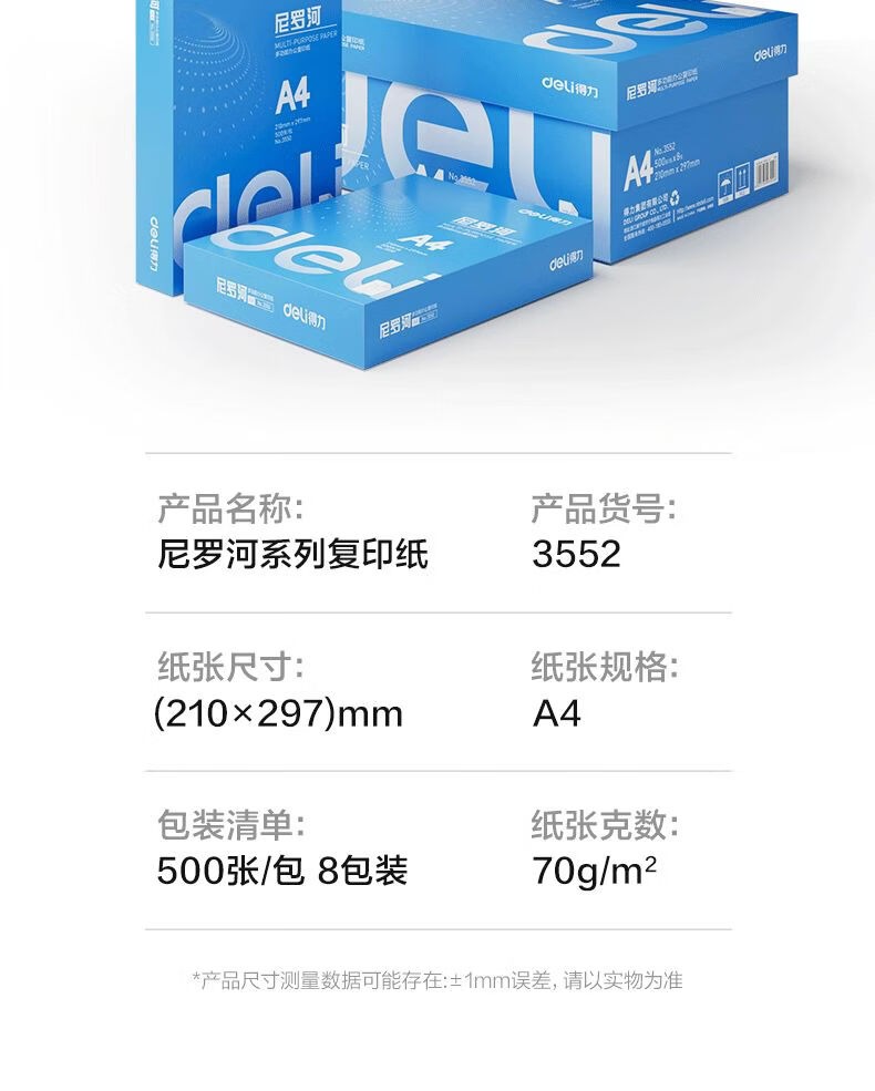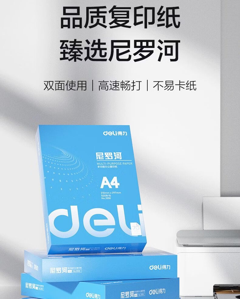 得力尼罗河a4影印纸7080g双面打印办公用白纸学生用纸草稿纸 得力塞纳河A470克整箱8包4000张