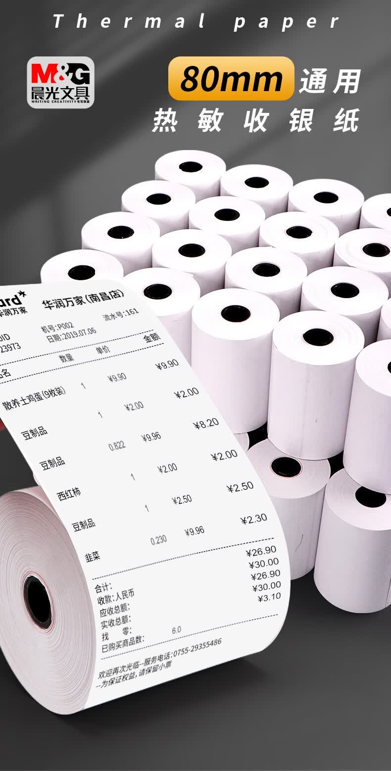 晨光(M&G) 热敏收银纸打印机卷纸超市小票纸美团外卖打印纸 80*57(整箱共50卷)无胶芯