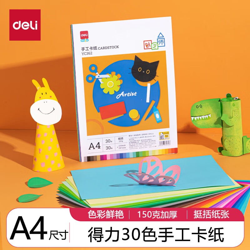 得力卡纸 硬纸a4手工硬卡纸彩色卡纸 小学生儿童幼儿园剪纸制作材料学生美术画画用 A4 30色 共30张 基础150g