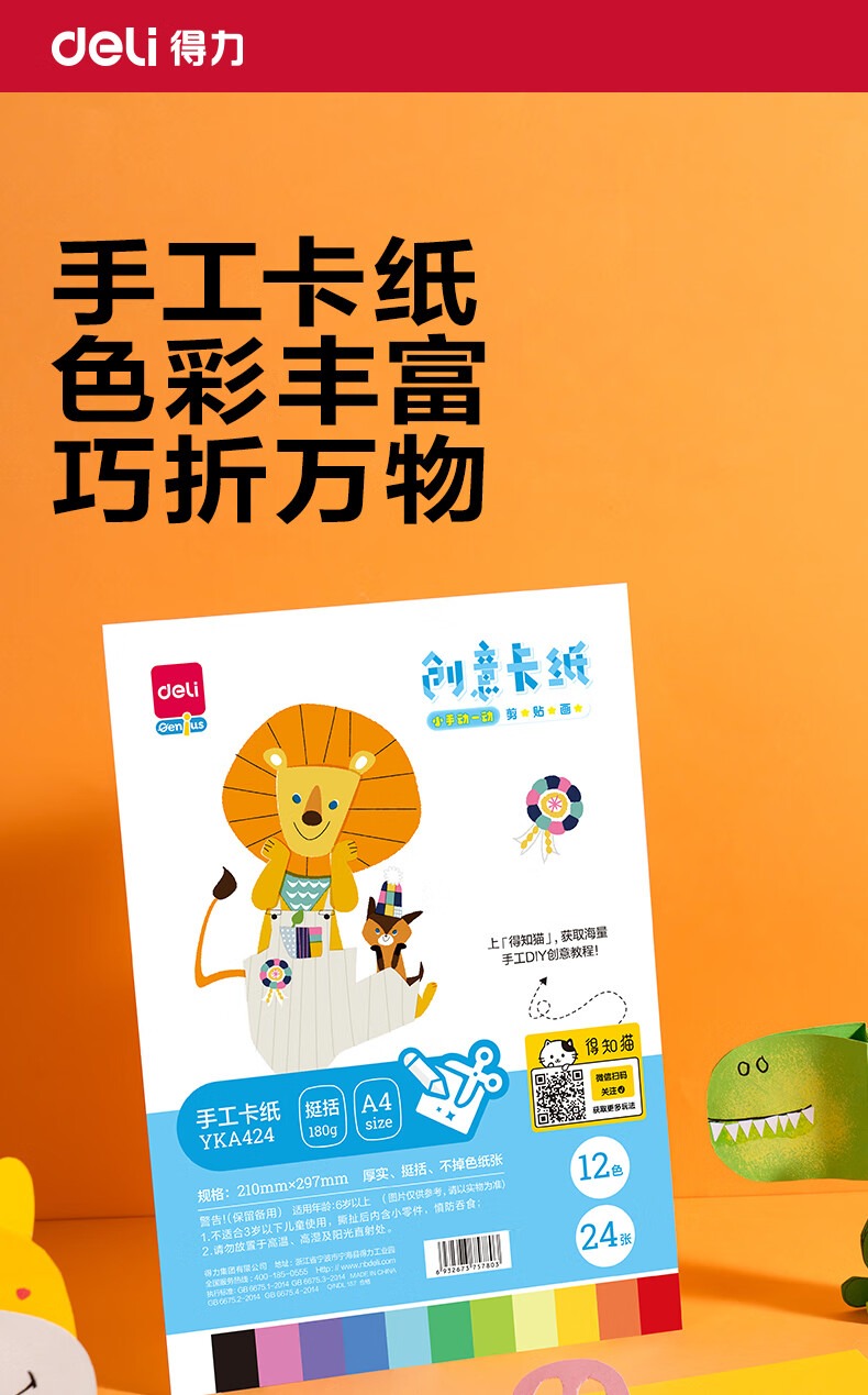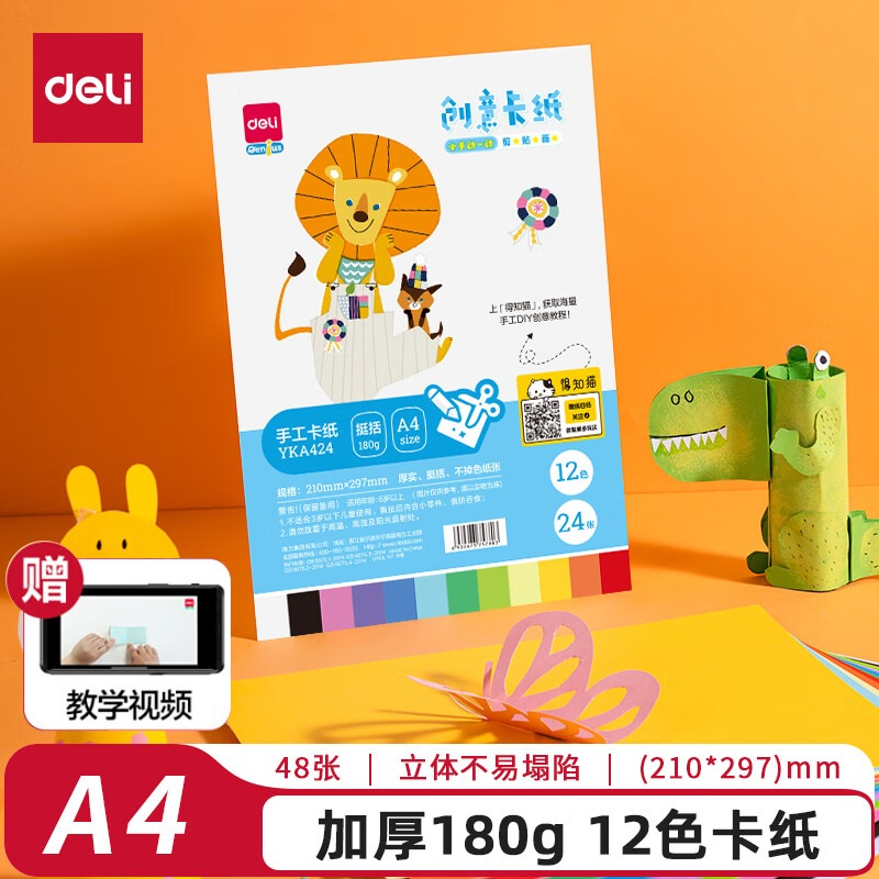 得力卡纸 硬纸a4手工硬卡纸彩色卡纸 小学生儿童幼儿园剪纸制作材料学生美术画画用 A4 12色 共48张 加厚180g